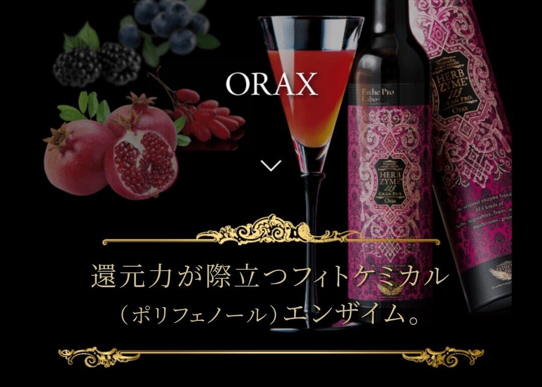 植物が自らを守るためにつくりだす「フィトケミカル(ポリフェノール)」に着目して研究開発した“還元力”が際立つ酵素飲料です。「ハーブザイム®113グランプロ オラックス」は、「フィトケミカル(ポリフェノール)」を豊富に含有した12種のフルーツを含む全113種の国産植物を伝統的な「ヒノキ樽」でダブル自然発酵させ90%も配合しました。いつまでも美しさを追求する方のためのハイクラス美容酵素飲料です。