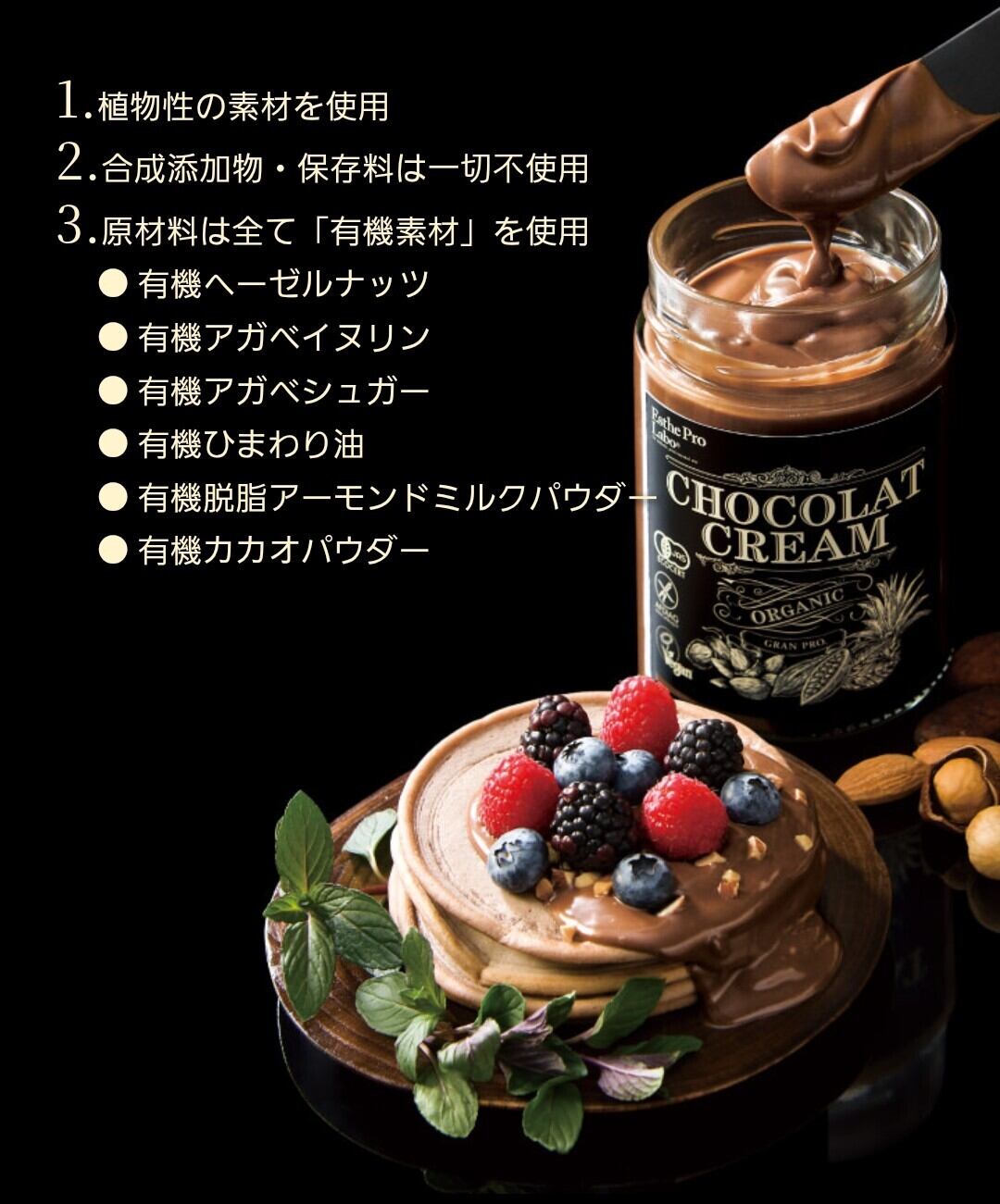 「ショコラクリーム オーガニック グランプロ」は、植物性由来のヴィーガン対応ショコラクリームです。1897年創業の老舗チョコレートメーカー『ダーデンカンパニー』とのコラボレーション※2によって実現した本製品は、グルテンや白砂糖、乳化剤を一切使用していません。